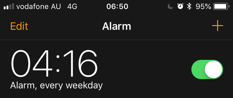 4:16AM every Monday to Friday. That’s when I get up.
